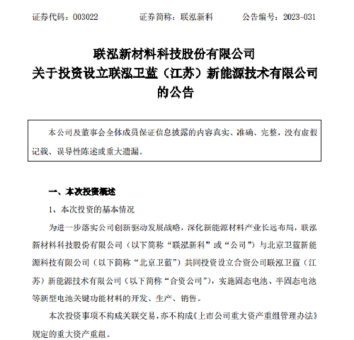 5月14日,聯(lián)泓新科發(fā)布公告,公司與北京衛(wèi)藍(lán)新能源科技有限公司(“北京衛(wèi)藍(lán)”)共同投資設(shè)立合資公司聯(lián)泓衛(wèi)藍(lán)(江蘇)新能源技術(shù)有限公司,實(shí)施固態(tài)電池、半固態(tài)電池等新型電池關(guān)鍵功能材料的開發(fā)、生產(chǎn)、銷售。