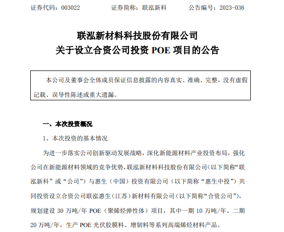 8月23日,聯(lián)泓新材料科技股份有限公司與惠生(中國)投資有限公司共同投資設立了聯(lián)泓惠生(江蘇)新材料有限公司。其中,聯(lián)泓新科出資4.55億元,占合資公司注冊資本的65%;惠生中投出資2.45億元,占合資公司注冊資本的35%。聯(lián)泓惠生新材料主要從事POE(聚烯烴彈性體)等高端烯烴材料業(yè)務,規(guī)劃建設30萬噸/年POE項目,其中一期10萬噸/年、二期20萬噸/年,生產(chǎn)POE光伏膠膜料、增韌料等高端產(chǎn)品。